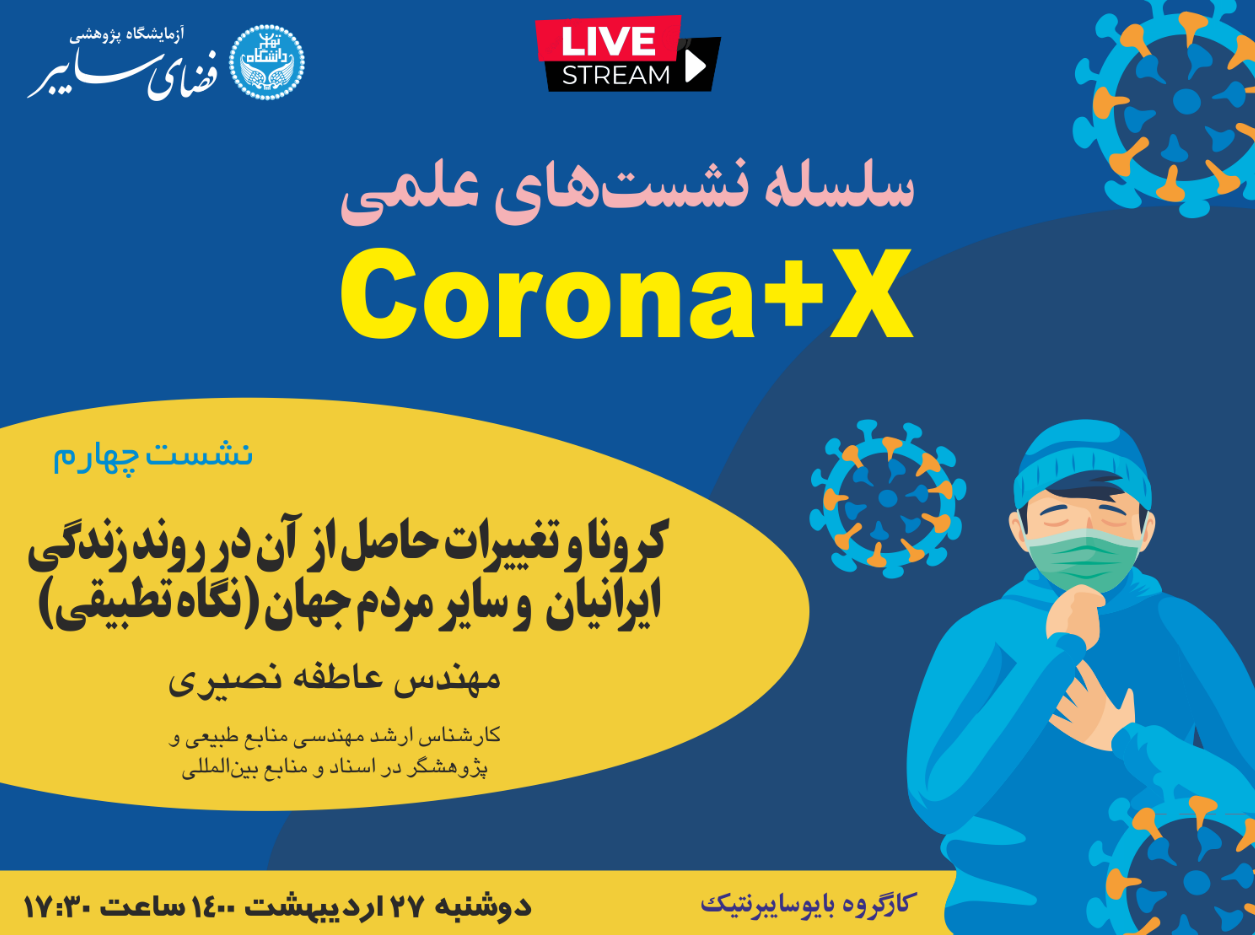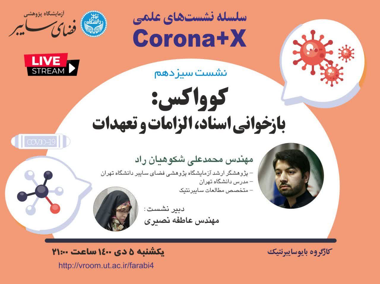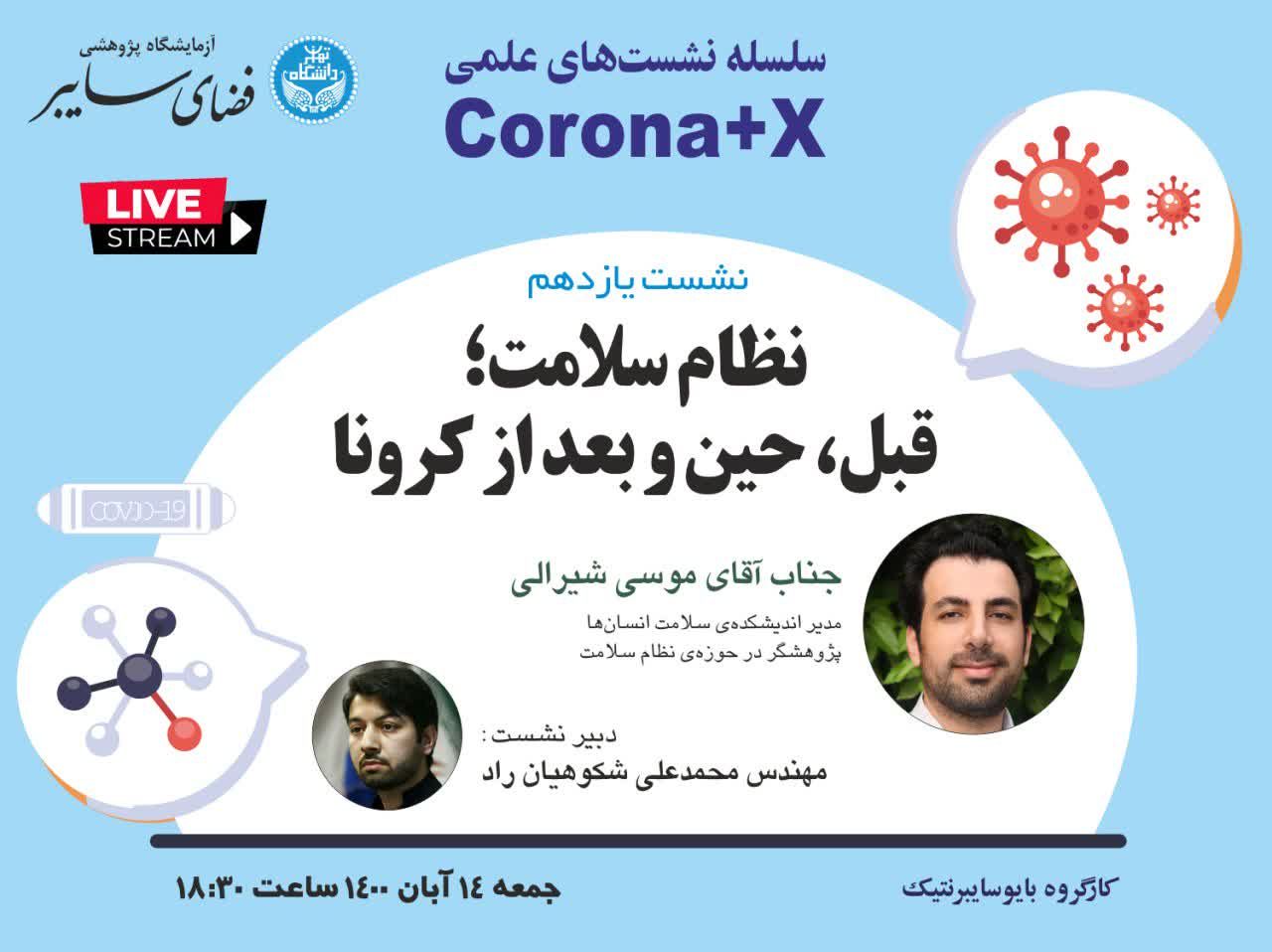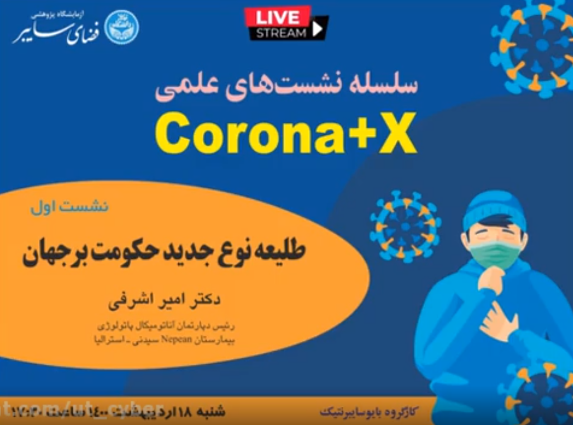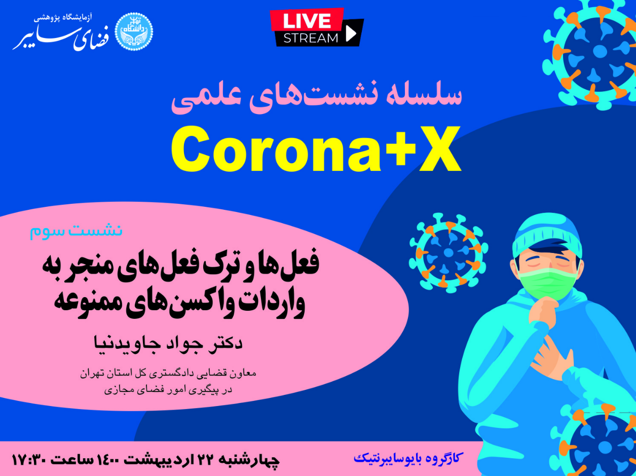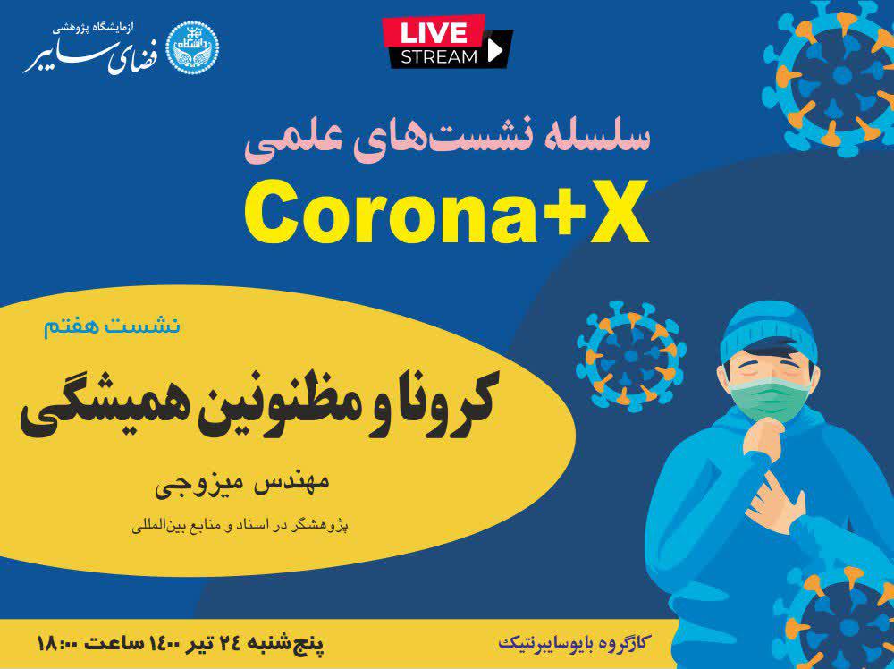 بههمت کارگروه بایوسایبرنتیک آزمایشگاه پژوهشی فضای سایبر دانشگاه تهران، سلسله نشستهای علمی Corona+X با حضور جمعی از اساتید داخلی و بینالمللی حوزوی و دانشگاهی برگزار میگردد. این نشستها از شنبه ۱۸ اردیبهشت ۱۴۰۰ آغاز و بهصورت وبینار تشکیل خواهد شد.