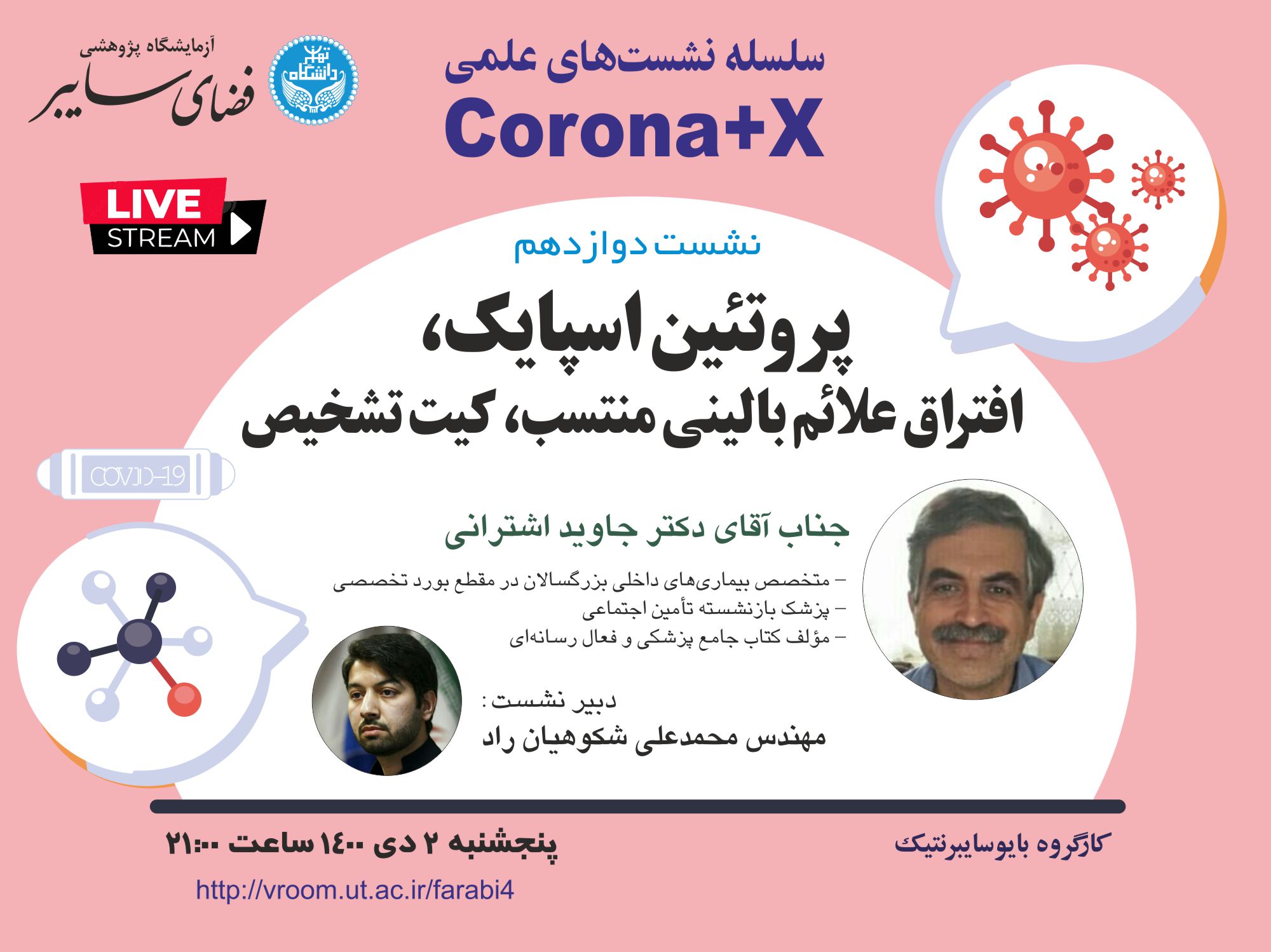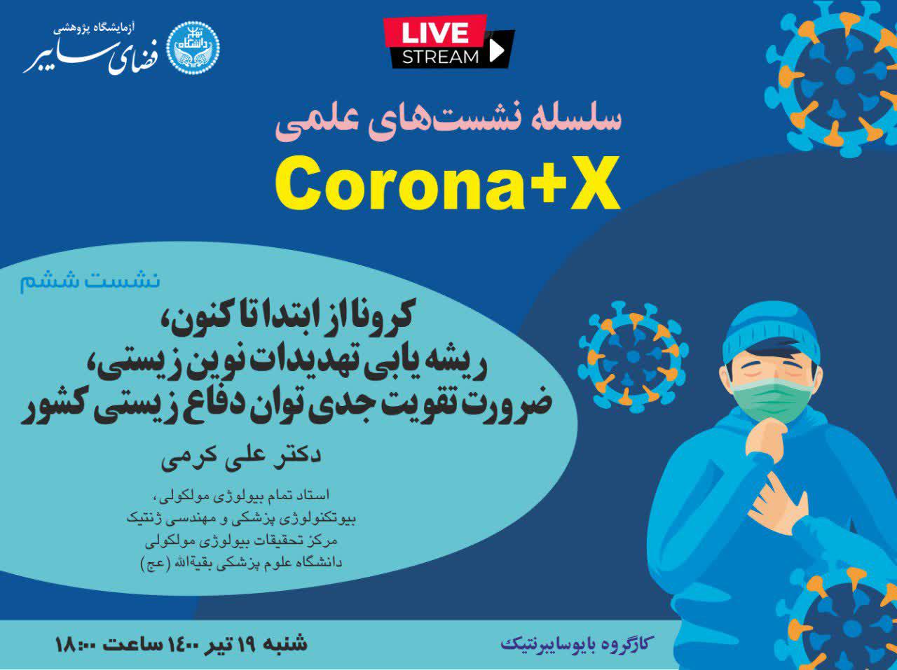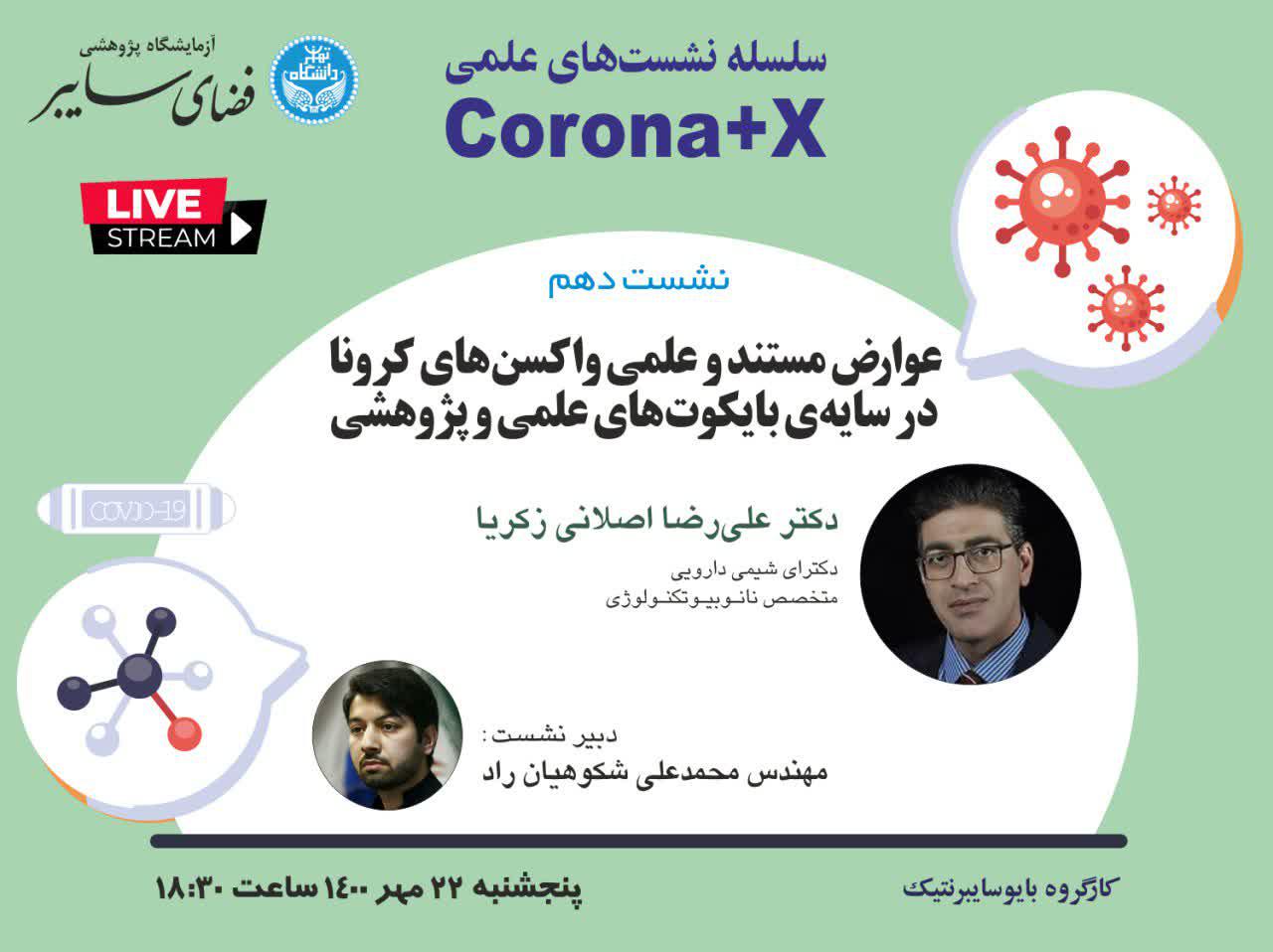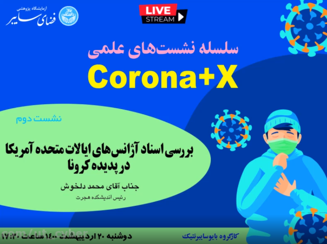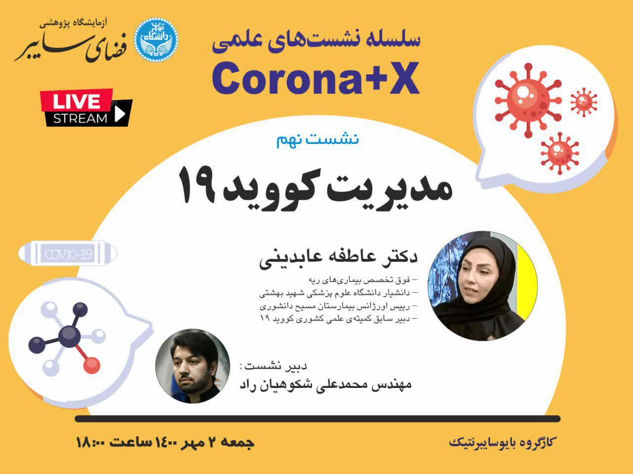 بههمت کارگروه بایوسایبرنتیک آزمایشگاه پژوهشی فضای سایبر دانشگاه تهران، سلسله نشستهای علمی Corona+X با حضور جمعی از اساتید داخلی و بینالمللی حوزوی و دانشگاهی برگزار میگردد. این نشستها از شنبه ۱۸ اردیبهشت ۱۴۰۰ آغاز و بهصورت وبینار تشکیل خواهد شد.